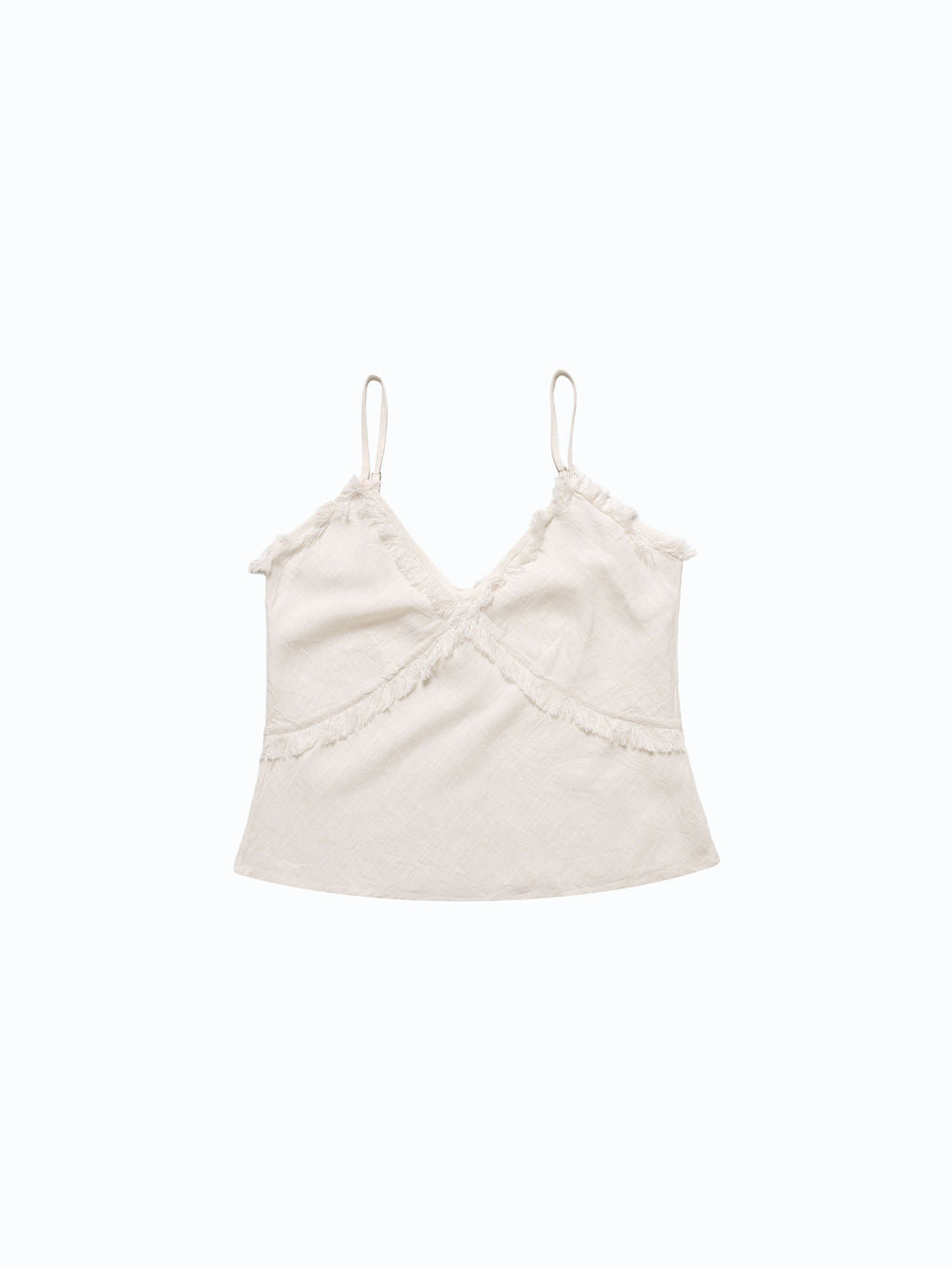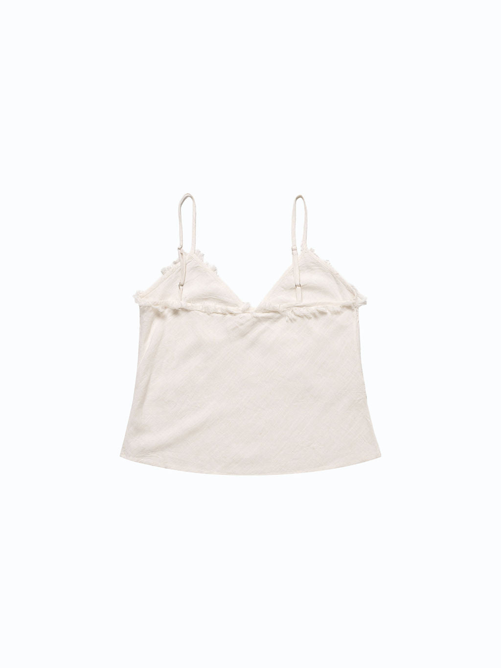 Our slip on bias cami trimmed with frayed detail that has been softened for comfort with adjustable straps. Worn relaxing at home or in an outdoor adventures. Classic and not at the same time .