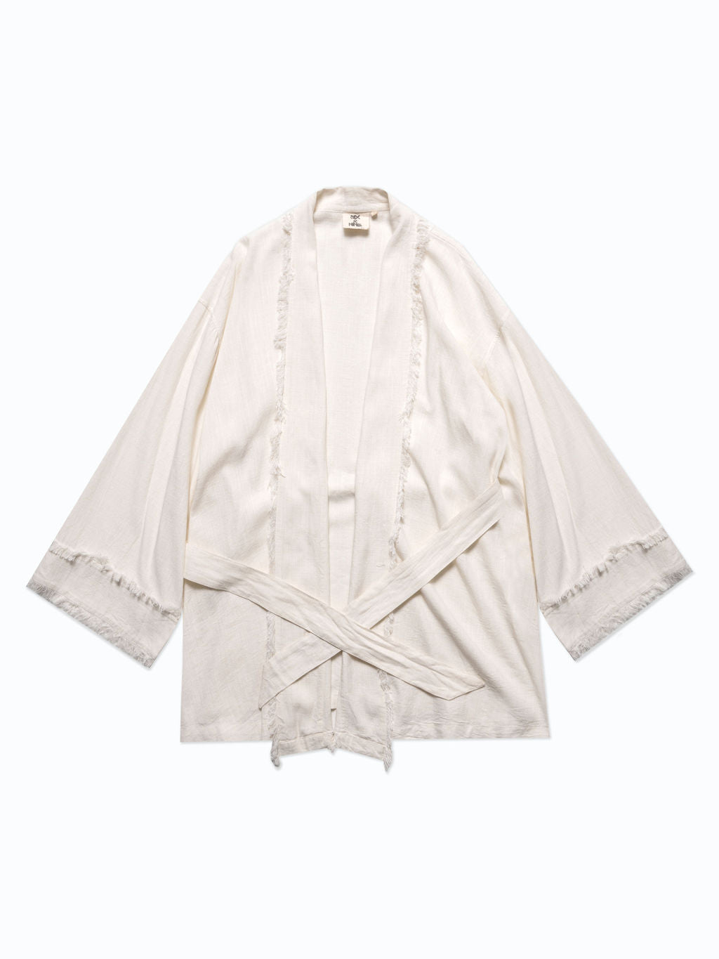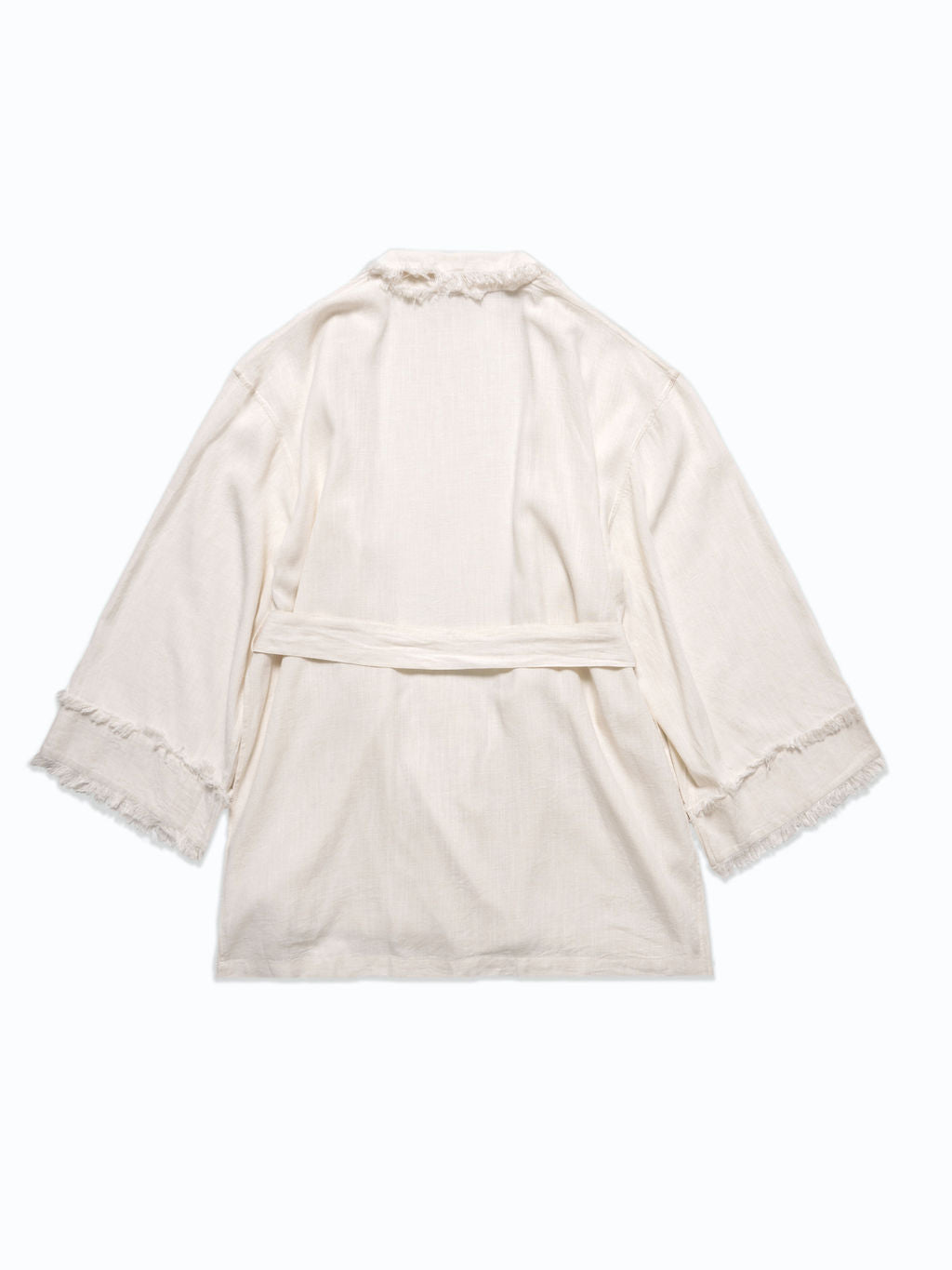 Oversized kimono robe trimmed with frayed detail that has been softened for comfort. Classic and not at the same time.