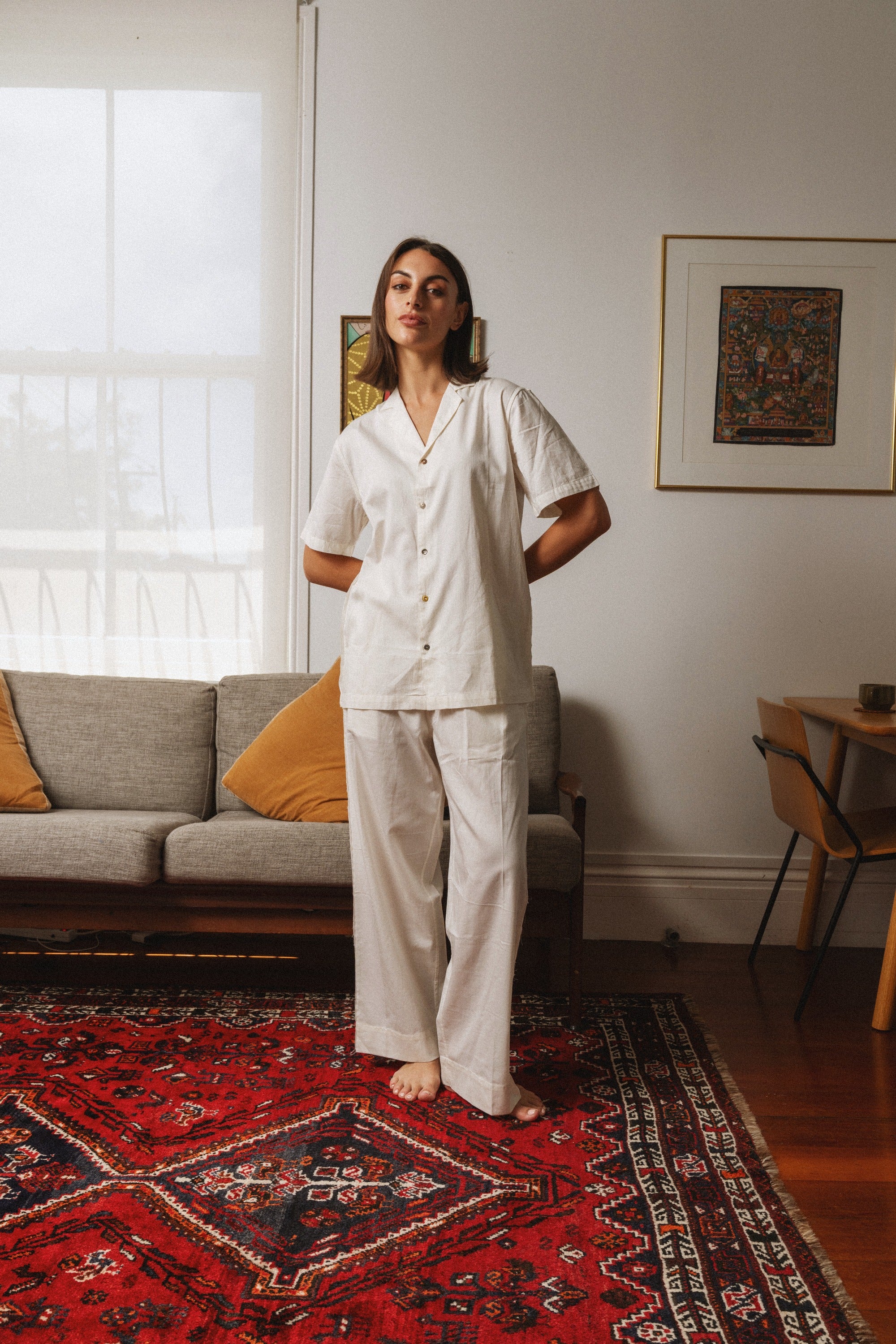Crafted for everyday comfort and style, these unisex pants feature an elasticated waist and a long straight-leg silhouette for a relaxed yet refined look. Raw side seams with contrast coverstitch detailing and a working button fly add thoughtful design touches, while front slash pockets offer easy functionality. Made from 100% cotton and lovingly crafted in India, they are built for lasting wear and effortless versatility.